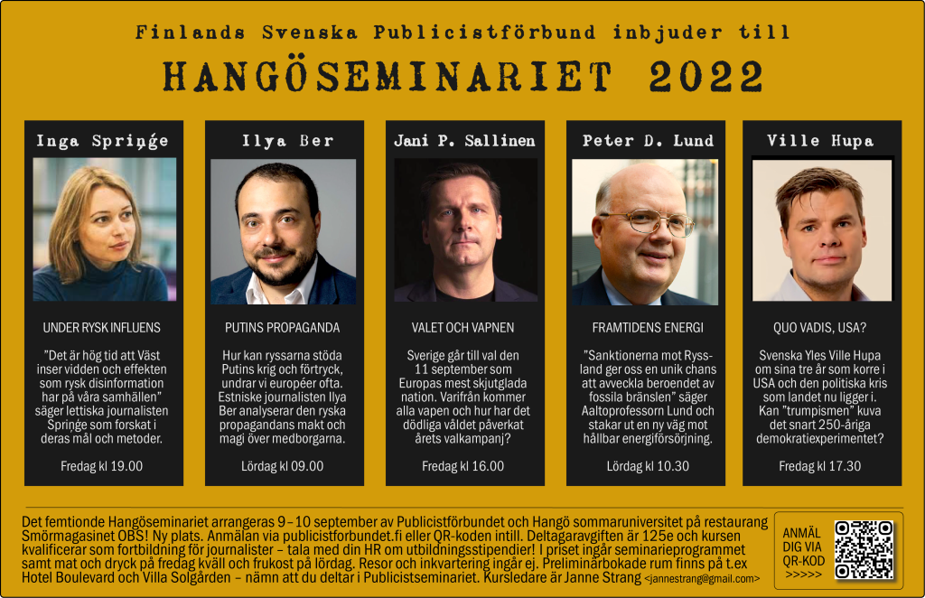 Nu kan du anmäla dig till vårt anrika Hangöseminarium som i år ordnas den 9-10 september! Den traditionella starten på nyhetshösten arrangeras i år för 50:e gången i samverkan med Hangö Sommaruni. Årets teman är krig och propaganda, energifrågan, svenska valet och skjutvapnen, samt USA:s öde. Kursledare och programansvarig är Janne Strang.